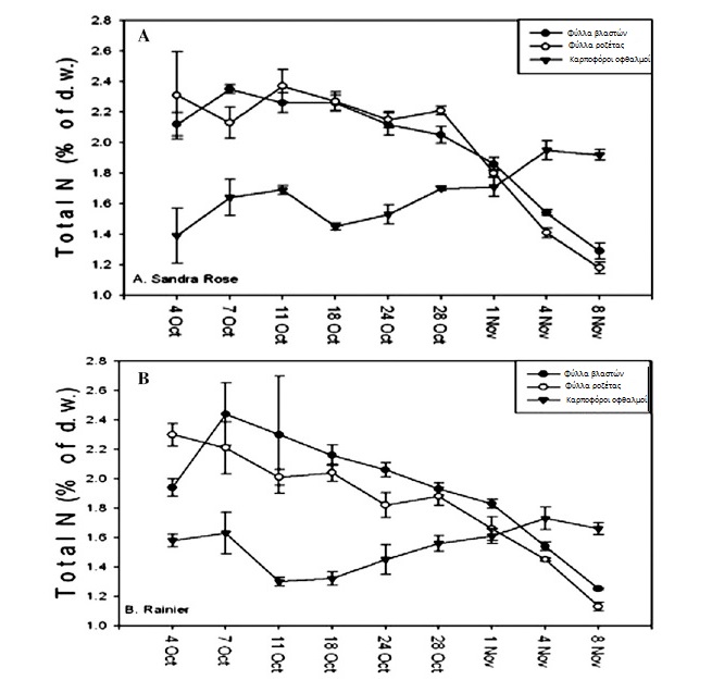 Διάγραμμα 1: Αλλαγές στην περιεκτικότητα αζώτου (% επί ξ.ο.) στις ποικιλίας Sandra rose/Gi5 (A) και B. Ranier/Gi5 (B) σε φύλλα βλαστών, φύλλα ροζέτας και ανθοφόρους οφθαλμούς στης διάρκεια του φθινοπώρου.